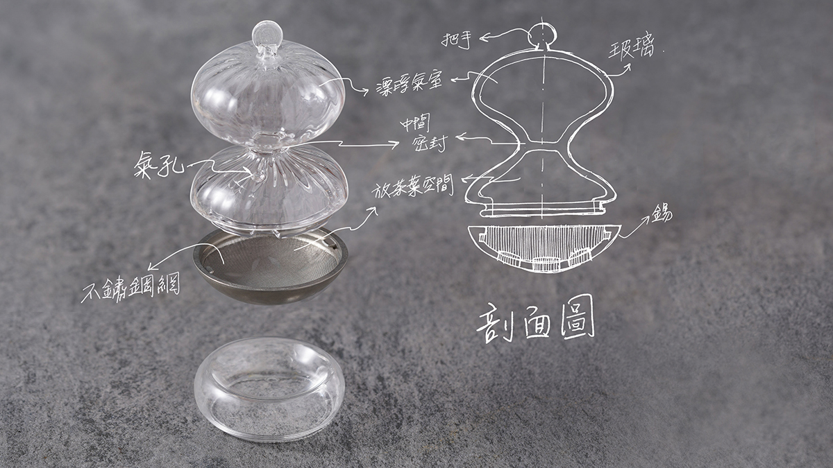 下半部:由玻璃與錫器接榫結合,內含不鏽鋼細網,為放茶葉的空間,可泡製 700cc 的茶湯。( 是否可回沖依茶款特性而定 )
