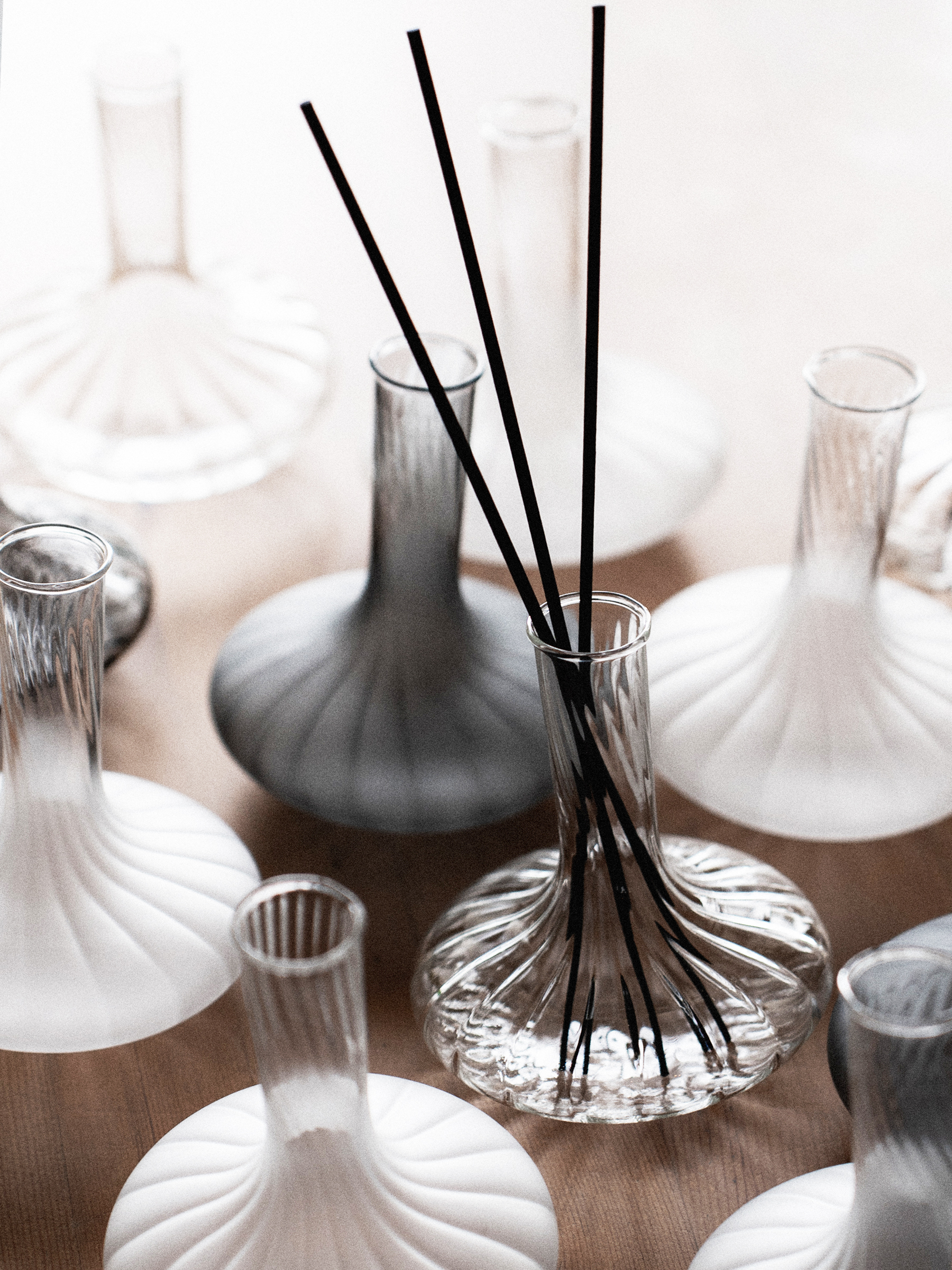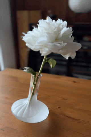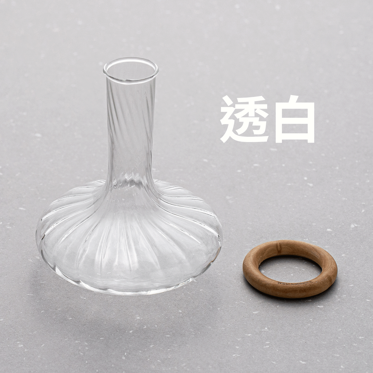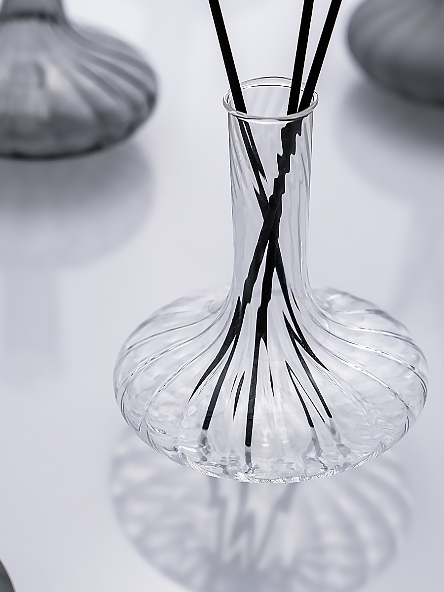 隨附的平衡木環,於擴香使用時輕輕嵌於器底,穩定瓶身,使氣味緩緩釋放。當移除木環,插入花材後,器身因花的重量而自然傾斜,彷彿一場無聲的舞蹈,在空間中帶出一抹不對稱的趣味動態。