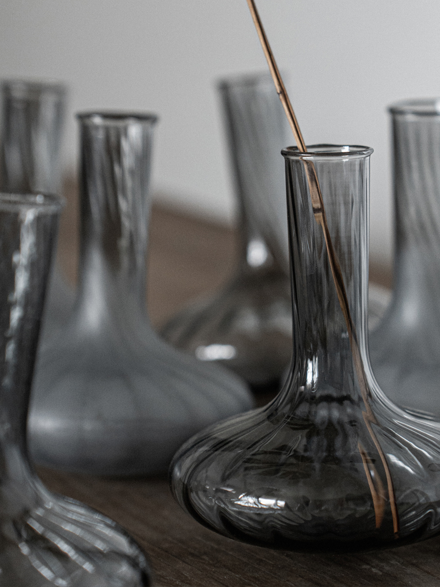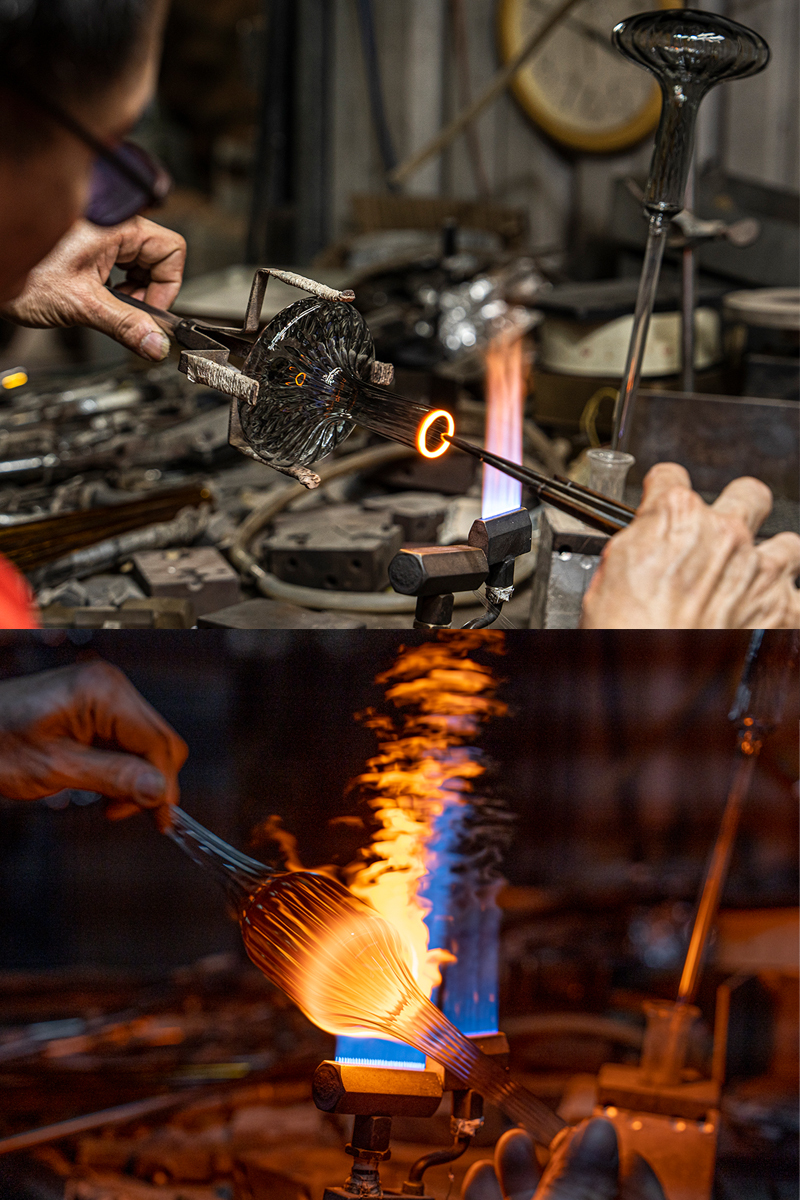 來自新竹的玻璃職人,以四十年手工技藝,以口吹工法塑出器物的生命形狀。選用條紋玻璃管,每件作品皆保有厚薄不一的質地與流動的光影層次,如晨光穿霧,為空間添入柔和與靜謐。這不只是器物,更是與生活共處的節奏。WOO 相信,美來自細節與情緒的累積,它不喧嘩,卻總能在某個瞬間,讓人停下,感覺時間正緩緩流動。