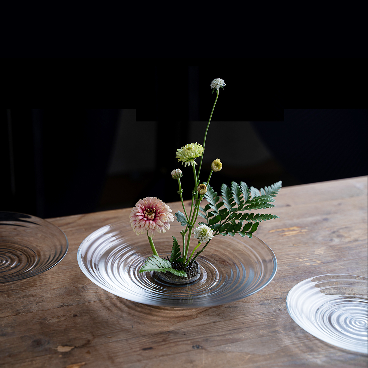 盤皿盛著食物或花葉,展現出沁涼的通透感。