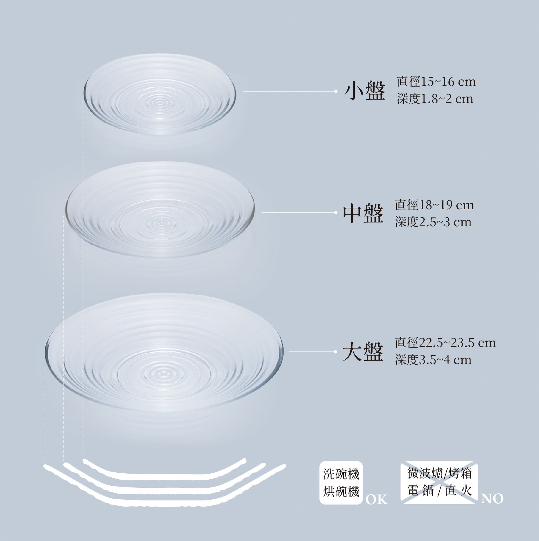 大中小盤皆適合盛裝中西餐或是冷盤,大、中深度適合盛裝有些許湯汁的菜色。