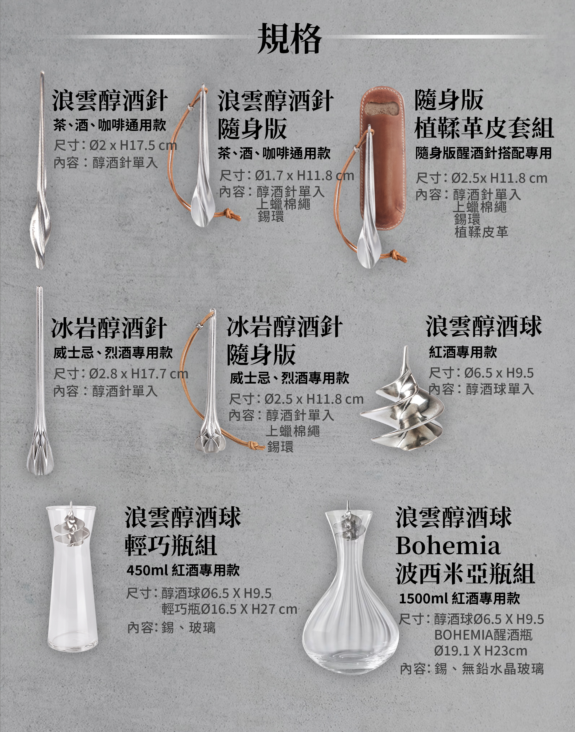 漩渦流水般的造型,象徵浪淘雲湧的豐沛意象,同時有效達到增加與酒接觸的錫表面積。在酒水順流而下時產生的水幕,更是一個美麗的視覺饗宴。浪雲醇酒球搭配醒酒瓶時,除了酒水與錫接觸使酒更醇厚之原理外,亦有一般紅酒醒酒器與空氣接觸氧化之傳統醒酒效果。以螺旋造型表面積(L)算式計算,浪雲醇酒球表面積(S)達109平方公釐,讓酒旋轉而滑落的路程加長,以輕柔的速度達到完美的醒酒效果。