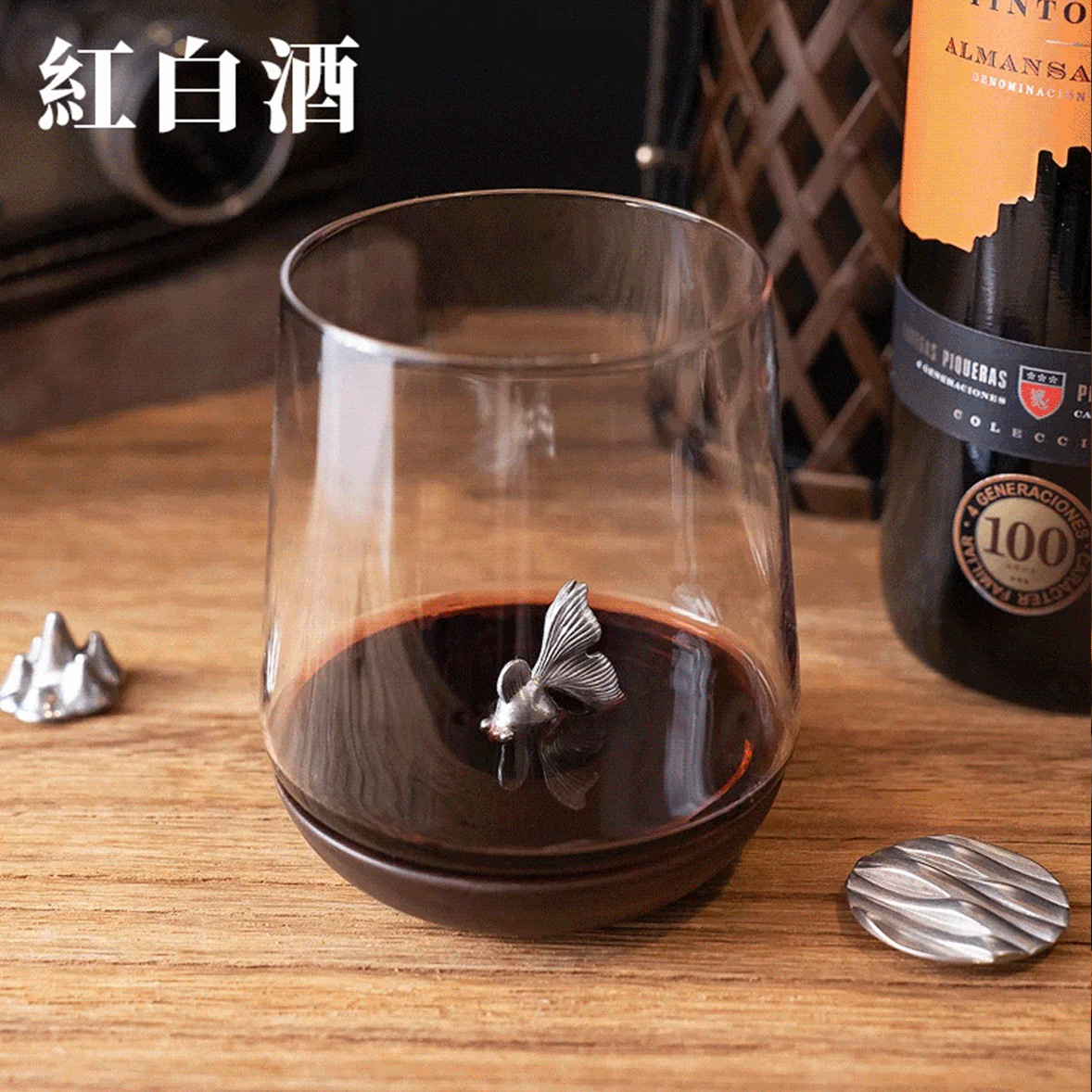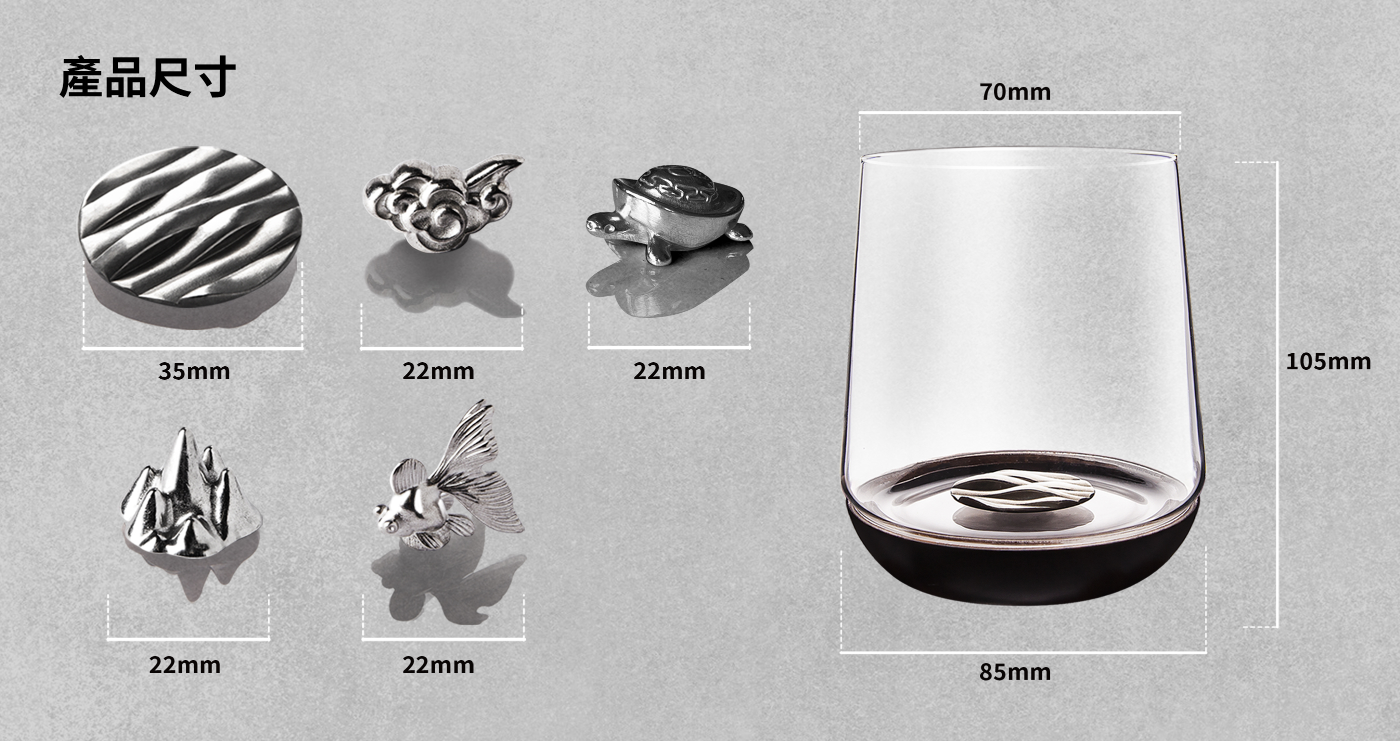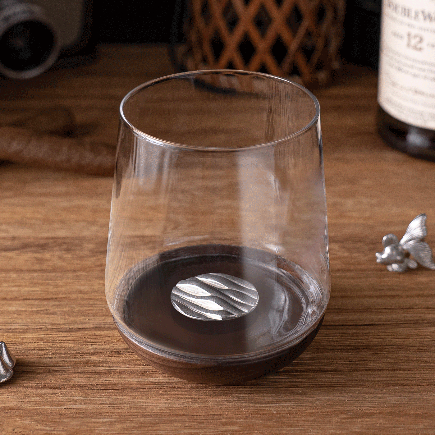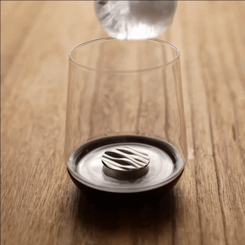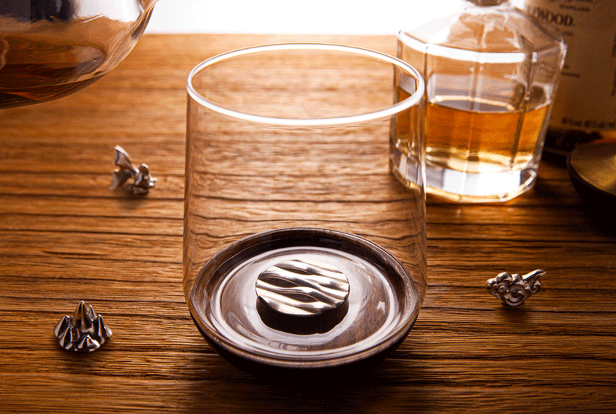 玻璃杯底結合胡桃木的獨特設計,加上專利引力結構,可在玻璃杯內吸附各種造型純錫製公仔,360度旋轉倒置、相吸不脫離。