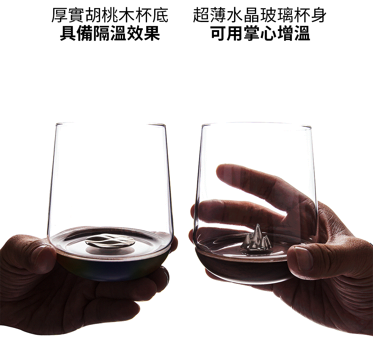 可依據手握的位置,來微調杯中烈酒的溫度。杯底為厚實的胡桃木,可以隔絕手溫。上方水晶玻璃杯身非常薄透,若需些微溫熱酒體,可握著上方杯身,可傳導手溫,增加香氣。