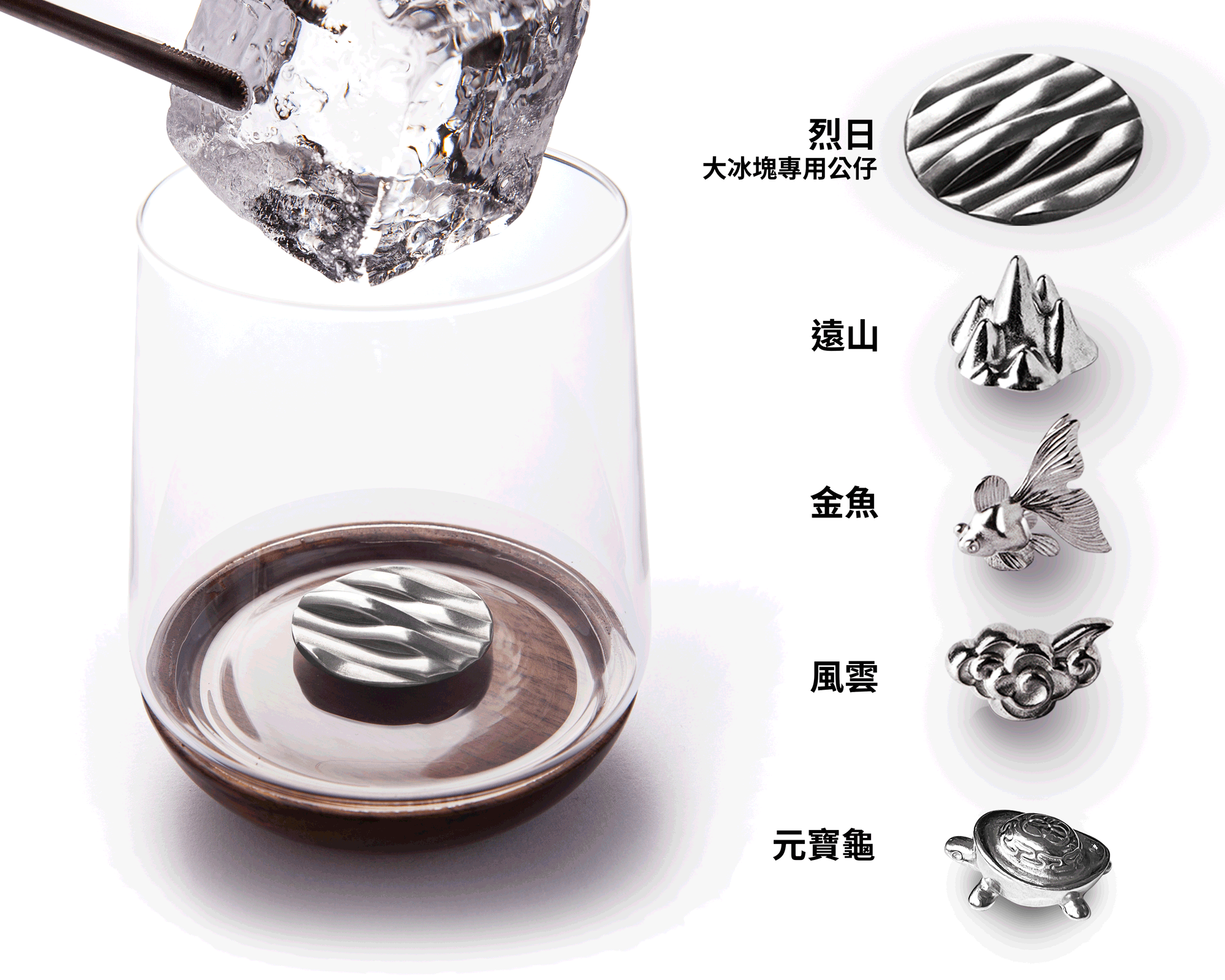 扁平波浪造型的「烈日」純錫公仔,飲用烈酒要加大冰塊時,不易受到冰塊推擠移位。在純飲的時候也能與少量的烈酒,擁有最大接觸面積。另外還有三款立體造型可以選擇(立體造型不建議加大冰使用)。