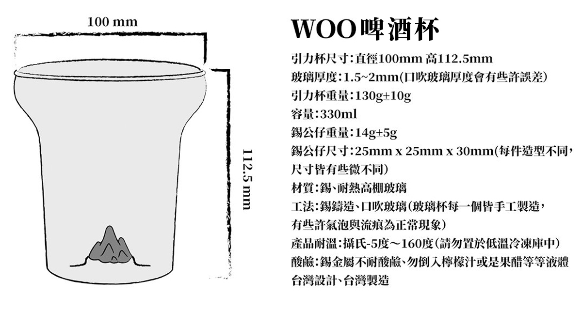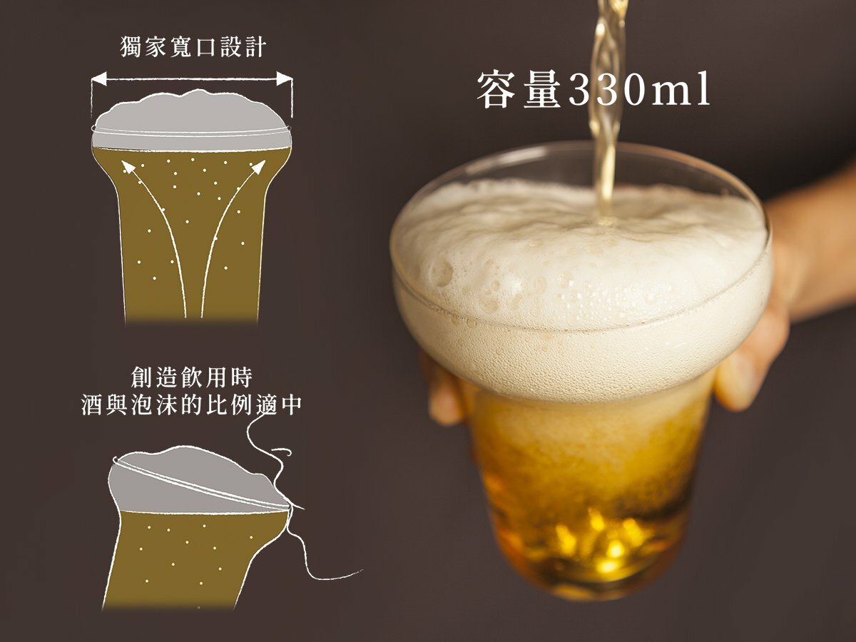 杯子容量為剛剛好330ml設計,創造啤酒與泡沫的比例適中,設計美感位兼具實用功能。