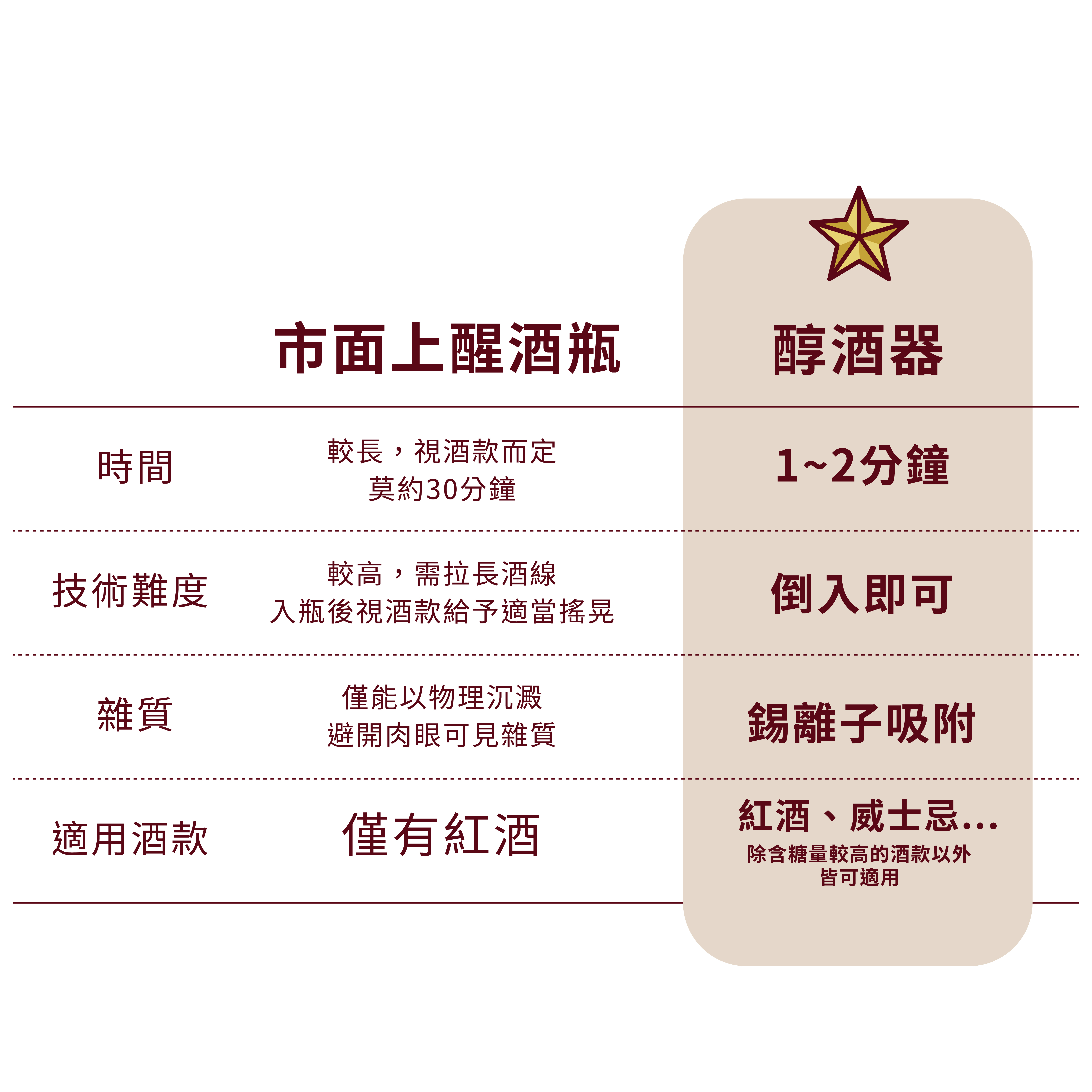 台灣第一個錫製醒酒器,可以提升酒品的醇厚口感與層次,適用紅酒、威士忌、清酒等,手工製造九道工序造就完美。螺旋設計搭配玻璃器皿倒出華麗紅酒水幕,純錫製造,安全無毒。淨化水質、抑菌且不易氧化。
