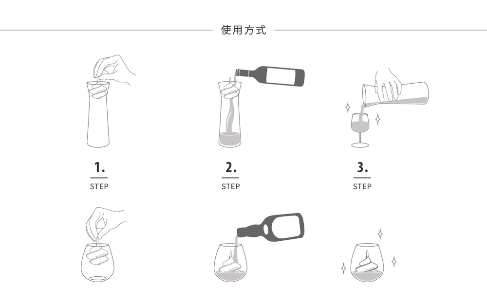 醇酒球使用時,可簡單將其置於酒中1-2分鐘,即可享用超覺醒酒感。若飲用紅酒,則需搭配醒酒瓶。將紅酒於醇酒球上方倒入醒酒瓶中,酒水順著螺旋形流瀉而下後,取出醇酒球,便可將紅酒倒入杯中飲用。